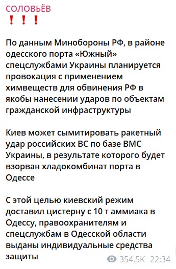 За браком успіхів на полі бою, саме терор і поширення панічних настроїв серед мирних українців залишаються останньою зброєю агресора. Ці настрої намагаються провокувати заявами Міністерства оборони РФ на кшталт: «В районі одеського порту «Південний» спецслужбами України планується провокація із застосуванням отруйних хімічних речовин для звинувачення військ РФ у нібито завданні ударів по об’єктах цивільної інфраструктури…».