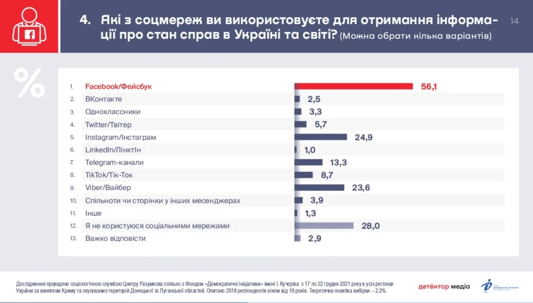 Абсолютна більшість українців (56%) серед соціальних мереж для отримання інформації обирає фейсбук. Трійку лідерів за ним замикає інстаграм (25%) та вайбер (24%). При цьому телеграм значно поступається аудиторією вайберу. Його використовують лише 13% респондентів переважно для отримання місцевих новин (20%), інформації про життя спільноти (19%), політичні події (20%), економічну ситуацію (16%), охорону здоров’я (15%) та з тематичних сфер, якими цікавляться респонденти (18%).