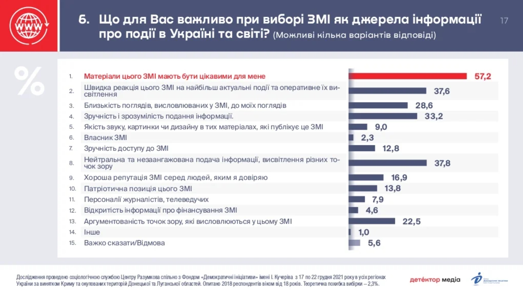 При обранні медіа як джерела інформації більшість опитаних повідомили, що звертають увагу на цікавість матеріалів (57%), незаангажованість подачі інформації (38%), оперативність висвітлення подій (38%), зручність подання інформації (33%) та близькість поглядів (29%). Такі маркери прозорості роботи медіа, як інформація про власника та джерела фінансування, істотно впливають на вибір менше 5% респондентів.