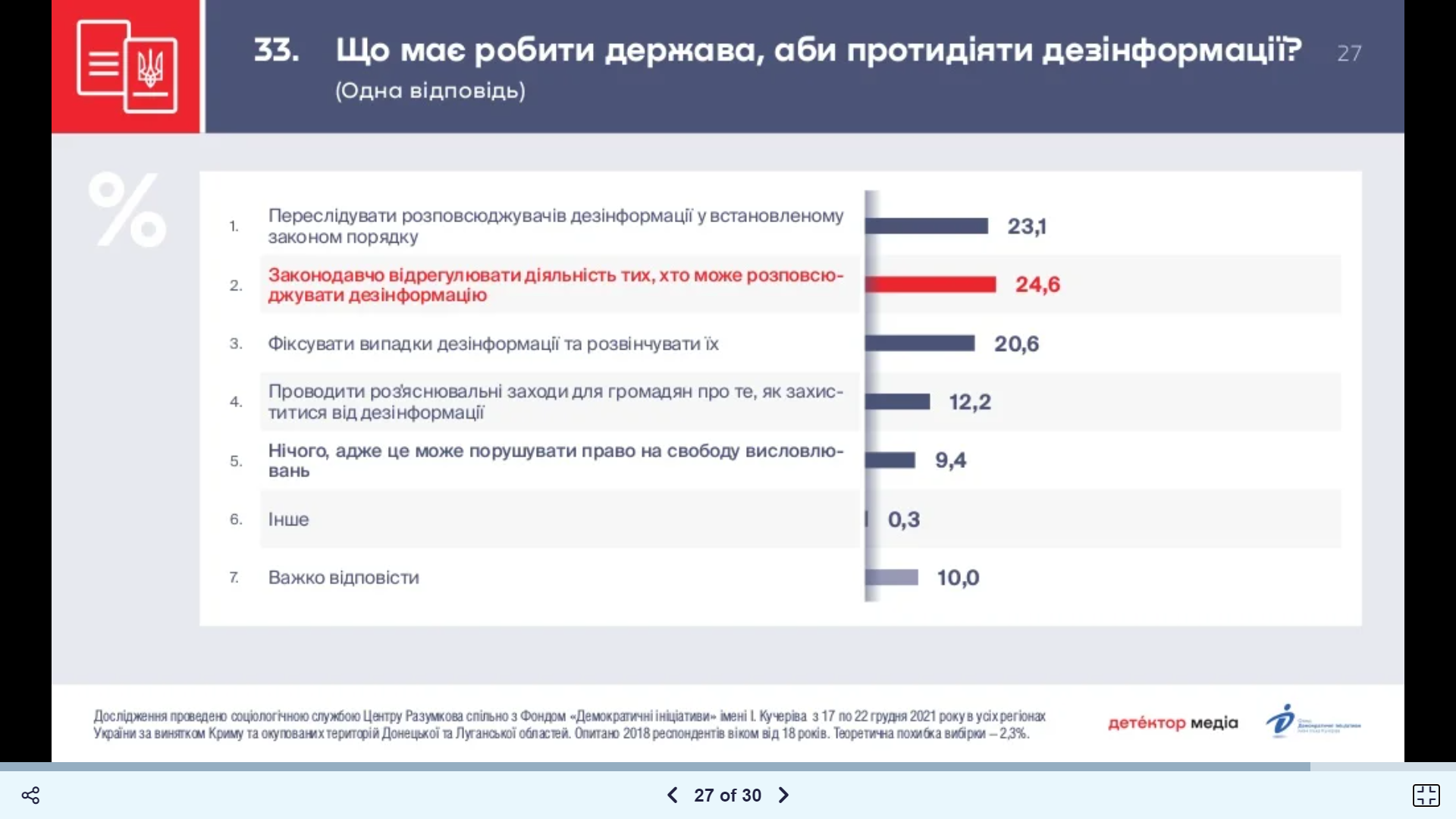 Серед громадян немає одностайності, що важливіше, — свобода слова чи захист держави від дезінформації: 41% вважає, що свобода слова, 42% – захист держави, 17% – не визначилися. Що ж до дезінформації, то чверть схиляється до того, що держава має законодавчо врегулювати роботу тих, хто може розповсюджувати дезінформацію. 23% вважають необхідним, щоб держава переслідувала дезінформаторів за законом. 21% респондентів готові підтримати державу у боротьбі проти дезінформації, якщо держава спрямує свої зусилля на фіксацію дезінформації та її розвінчування. Варто звернути увагу, що коли респондентів запитували виключно про методи боротьби проти дезінформації, лише 9% сказали, що держава не повинна вдаватися до будь-яких цілеспрямованих дій, бо це може зашкодити свободі слова.