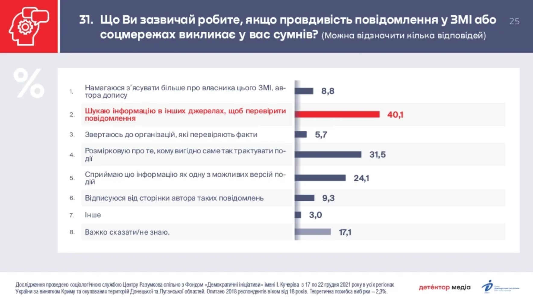 У 68% українців періодично виникають сумніви щодо правдивості інформації, яку вони отримують зі ЗМІ або соціальних мереж. Найпопулярнішими стратегіями фактчекінгу у таких випадках стають пошук інформації у альтернативних джерелах (40%); розмірковування про те, кому вигідно саме так трактувати події (32%); сприйняття такої інформації як однієї з можливих версій подій (24%). Лише 6% повідомили, що у таких випадках звертаються до організацій, які перевіряють факти.