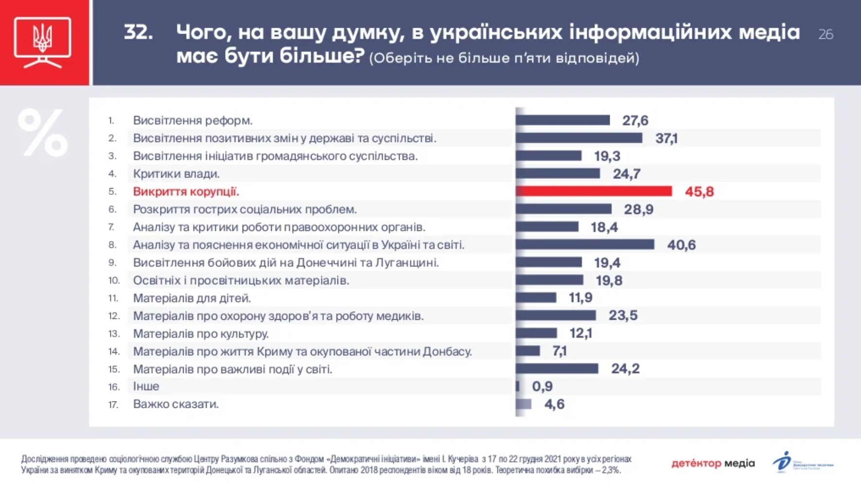 На сьогодні українці відчувають гостру нестачу в інформаційному просторі викриття корупційних дій (46%), аналізу та пояснення економічної ситуації в Україні та світі (41%) і висвітлення позитивних змін у державі та суспільстві (37%). Найменш актуальним, на думку людей, є збільшення кількості матеріалів про культуру (12%), матеріалів для дітей (12%) та матеріалів про життя тимчасово окупованих територій Криму та Донецької і Луганської областей (7%).