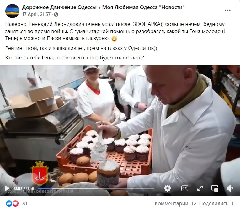 6. Підрив довіри до місцевої влади; запевнення, що мер Одеси Геннадій Труханов займається неважливими речами, порівняно з головами інших міст; представлення звичайної участі мера в житті міста, як безглуздості; використання знецінювальних висловлювань: «А у нас Гена не спешит ни с чем…», «Кто же за тебя Гена, после всего этого будет голосовать?» та інше висміювання дій керівництва міста.