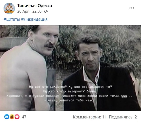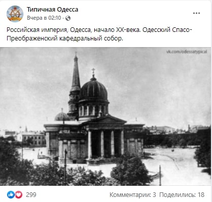 1. Традиційно найбільш розповсюдженою (понад 70% усіх пропагандистських матеріалів у пабліках) залишається «м’яка» пропаганда «єдиного минулого» України та Росії, наявність у тексті ностальгії за часами Російської імперії та СРСР, публікація архівних фотографій Одеси та міст Одеської області часто зі старими радянськими назвами та згадуванням про щасливі безтурботні часи тощо. Дуже часто такі фотографії містять посилання на відповідні сторінки у ворожій соціальній мережі «вконтакте».