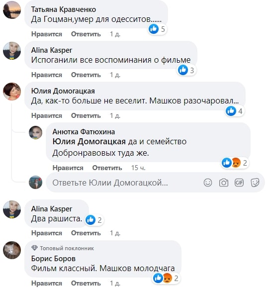 2. Публікація кадрів з кінофільмів, що були зняті в Одесі, з використанням зображень акторів, що відкрито підтримали війну росії проти України. Так на фото-прикладі ми бачимо зображення відомого путінського пропагандиста Володимира Машкова та актора Федора Добронравова, який не приховує, що схвалює дії російського диктатора.