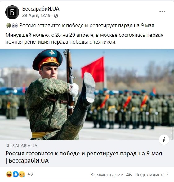7. Відтворення новин російської пропаганди разом з відповідним візуальним підкріпленням та представлення їх читачам як нейтральної інформації. Так, ми можемо навести приклад допису: «Россия готовится к победе и реперирует парад на 9 мая», який проілюстрований фотографією російського військового на параді, виконаної цілком в проросійському дусі. Навіть використання всередині тексту слова «москва» з маленької літери не нейтралізує загальний пропагандистський стиль допису.