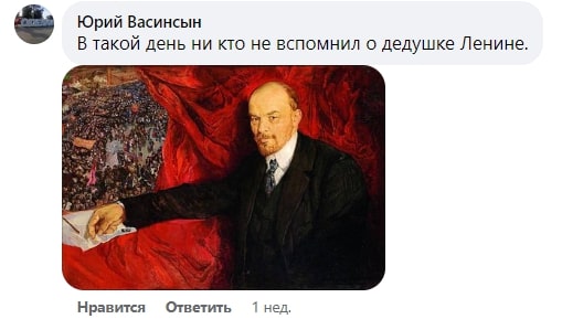 4. Згадування-натяки про день народження володимира леніна. Цього року в пабліках одеського регіону нами зафіксовані три таких випадки, причому зроблені в дуже обережній формі. Один в пості про акторів-близнюків, які знімалися в кінофільмі «Пригоди Електроника», де йдеться про те, що вони народилися 22 квітня 1966 року. При цьому додається: «для советского народа это была одна из самых главных дат в календаре – день рождения Владимира Ленина». Другий – в негативному контексті: «Сегодня страна, которая не в состоянии обеспечить своих пенсионеров ничем, кроме дерьма из телевизора… будет скрепно скрипеть про днюху ульянова /ленина/…» (нагадаємо, що навіть нагадування-засудження може бути прихованою пропагандою, хоча в даному випадку це малоймовірно). Третій випадок – в коментарі від користувача-бота із закритим профілем: