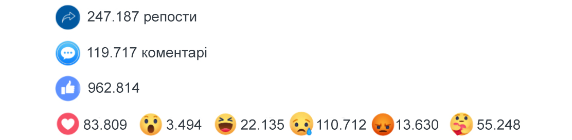 Сумарна кількість взаємодій з усіма дописами в пабліках становить 1 млн 618 тисяч 746: