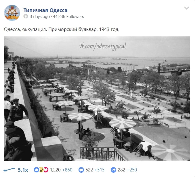 3. Публікація фотографій Одеси за часів окупації під час Другої світової війни, демонстрація «мирного життя» тих часів, «лагідне» просування ідеї, що окупація не є негативним явищем і «не все так однозначно». Зображення так само містять посилання на російську соціальну мережу «вконтакте».