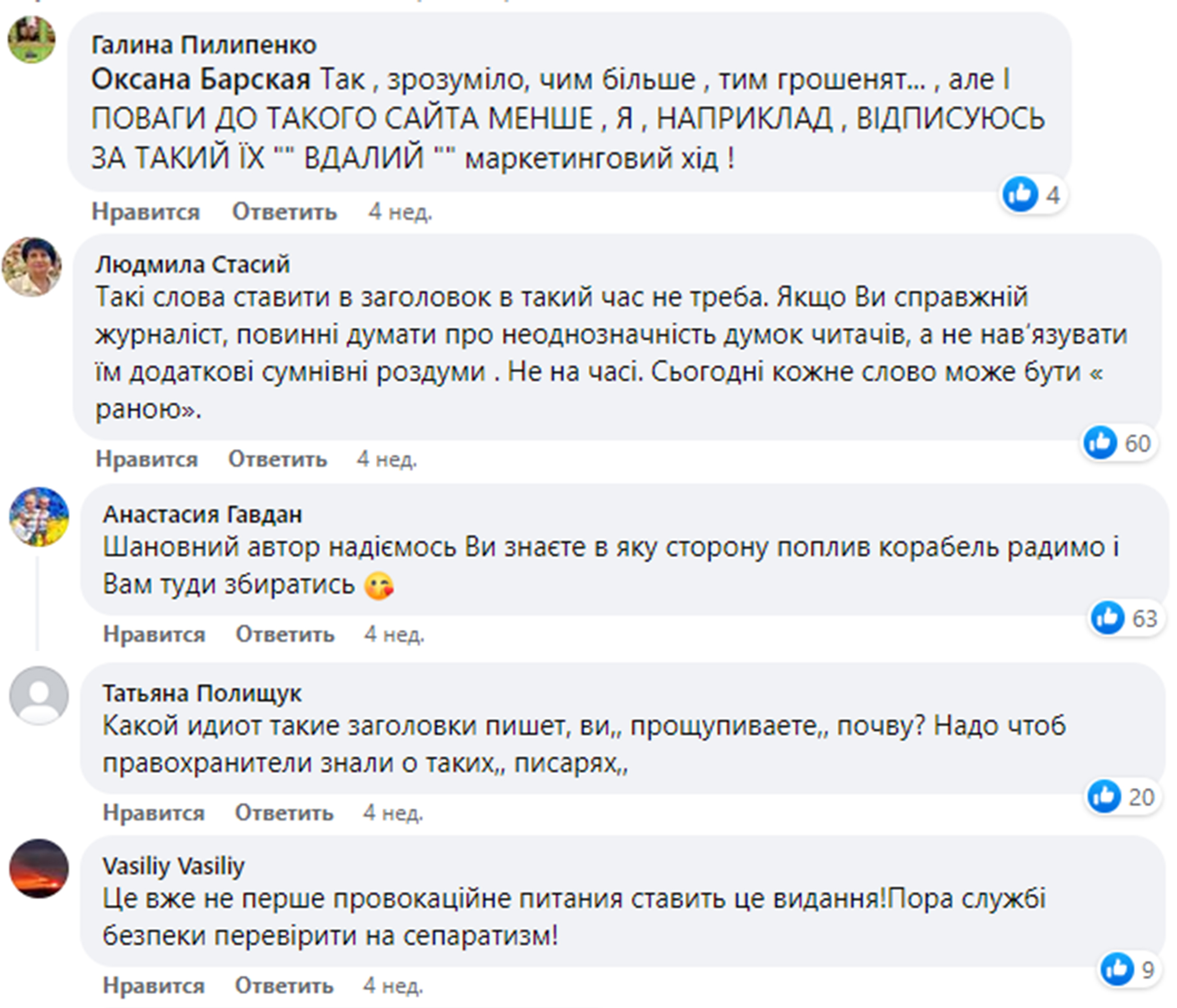 Вочевидь власники сторінки впевнені, що «правильна» позиція, яка була озвучена ними в тексти статті, слугує достатнім захистом від звинувачень у проросійській позиції. Але, як слушно зауважили розгнівані користувачі в коментарях, сам факт розмірковування на тему, чи варто здати місто ворогу – є недоречним під час війни. Об'єктивно такий допис надає противнику додатковий важіль інформаційного тиску у вигляді безпосередньої активності ботів під цим матеріалом та як інформаційний привід для подальших зусиль російської пропаганди.