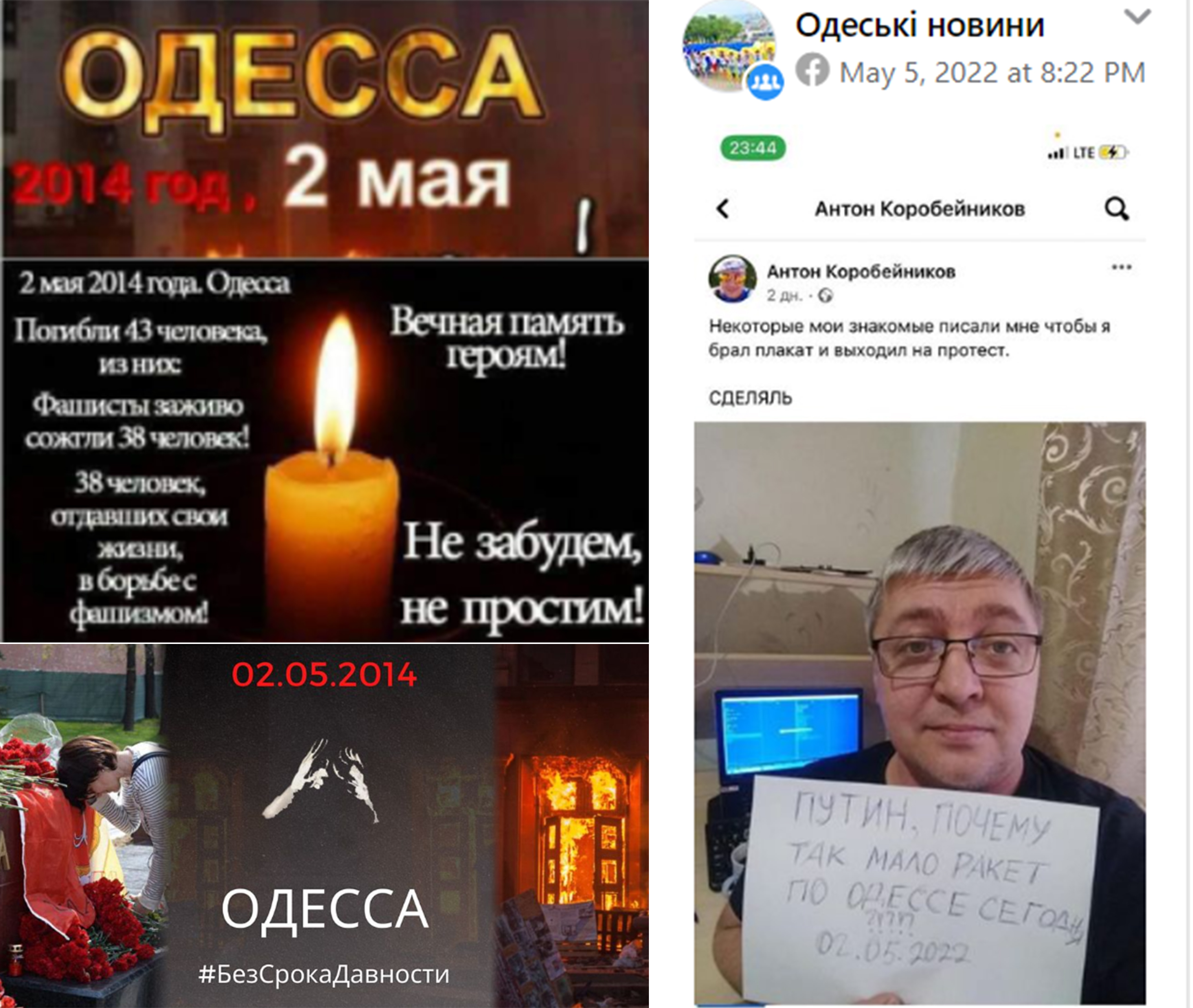 Ще однією темою, яку не обходить увагою проросійська пропаганда в цей період, безперечно, є події 2 травня 2014 року, які роспропаганда тиражує кожного року. Тоді в результаті сутичок між прибічниками Євромайдану та проросійськими активістами загинули більше 50 людей. Маніпулятивними методами росіяни зміщують акценти в подіях того дня в бік пожежі у Будинку профспілок, забуваючи про драму, що розігралася до того на Грецькій площі, а також про людей, що загинули там від вогнепальних поранень.