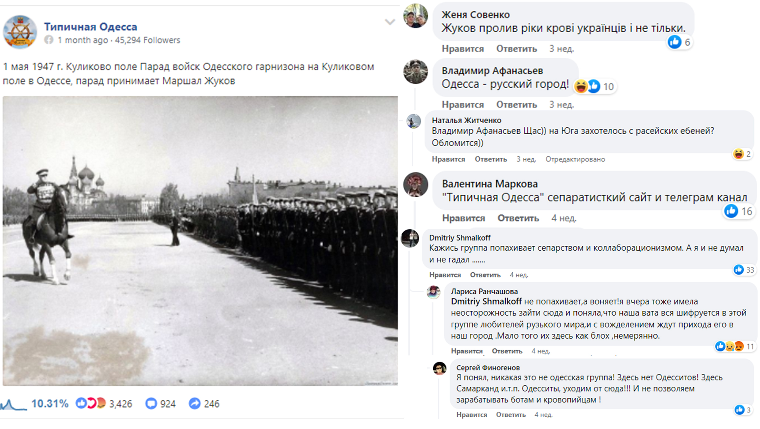 В якості прикладів пропаганди спільного героїчного минулого, що була оприлюднена на початку травня в одеських соціальних мережах, наведемо публікацію, яка присвячена параду військ Одеського гарнізону 1 травня 1947 року. Демонстрація спірної постаті маршала жукова в цій публікації викликала різко негативну реакцію серед одеських користувачів соціальних мереж, які в коментарях досить однозначно висловлювалися щодо проросійської спрямованості публікації, а також пабліку, що її розмістив.