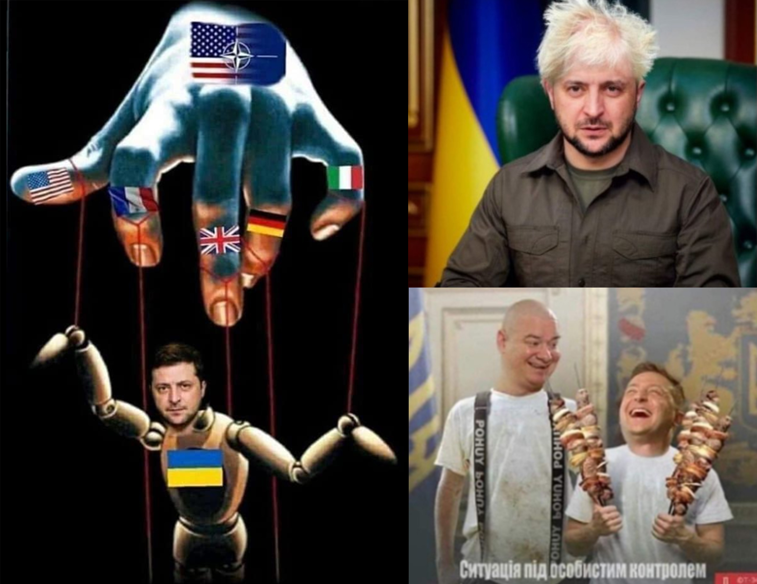 Так, варто згадати про ще один вид трансляції проросійських наративів – зневажливі згадування про Президента України Володимира Зеленського та спроби представити його як особу несамостійну, не надто розумну та таку, що не є окремою політичною одиницею. Декілька візуальних прикладів на цю тему, що несуть в собі відповідні пропагандистські меседжі, представлені нами нижче.