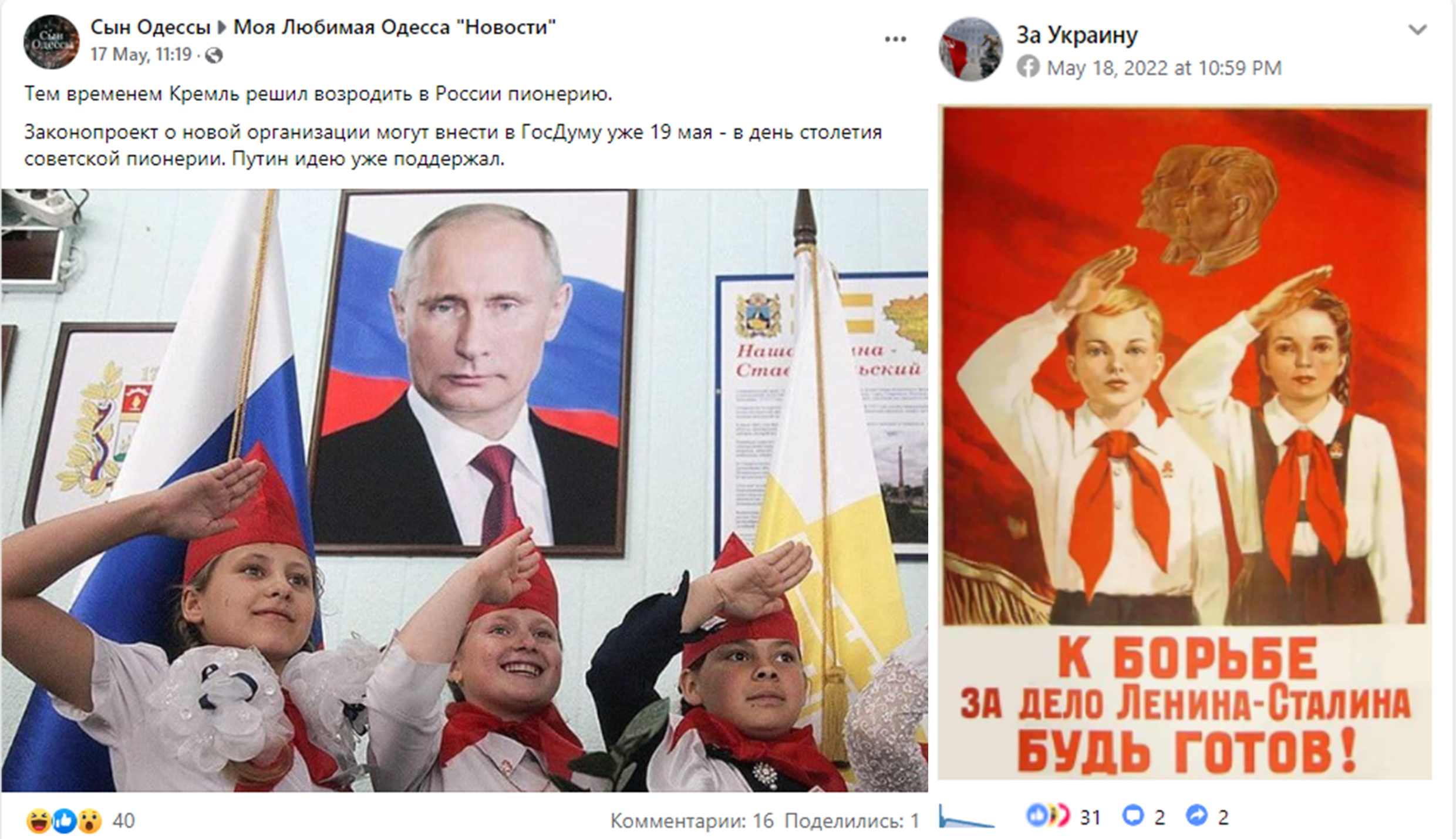 Проросійські меседжі зафіксовано також в частині дописів (34 дописи), які так чи інакше були присвячені дню піонерії та сторіччю її заснування. Зокрема були зафіксовані пости, що містили інформацію про відродження піонерської організації в рф, дописи ностальгічного характеру, а також публікації, де висміювалися піонери та піонерія.