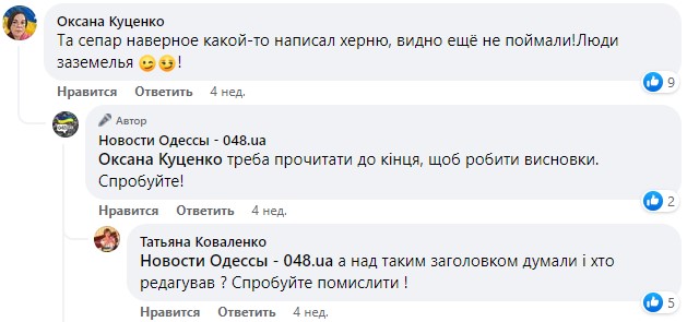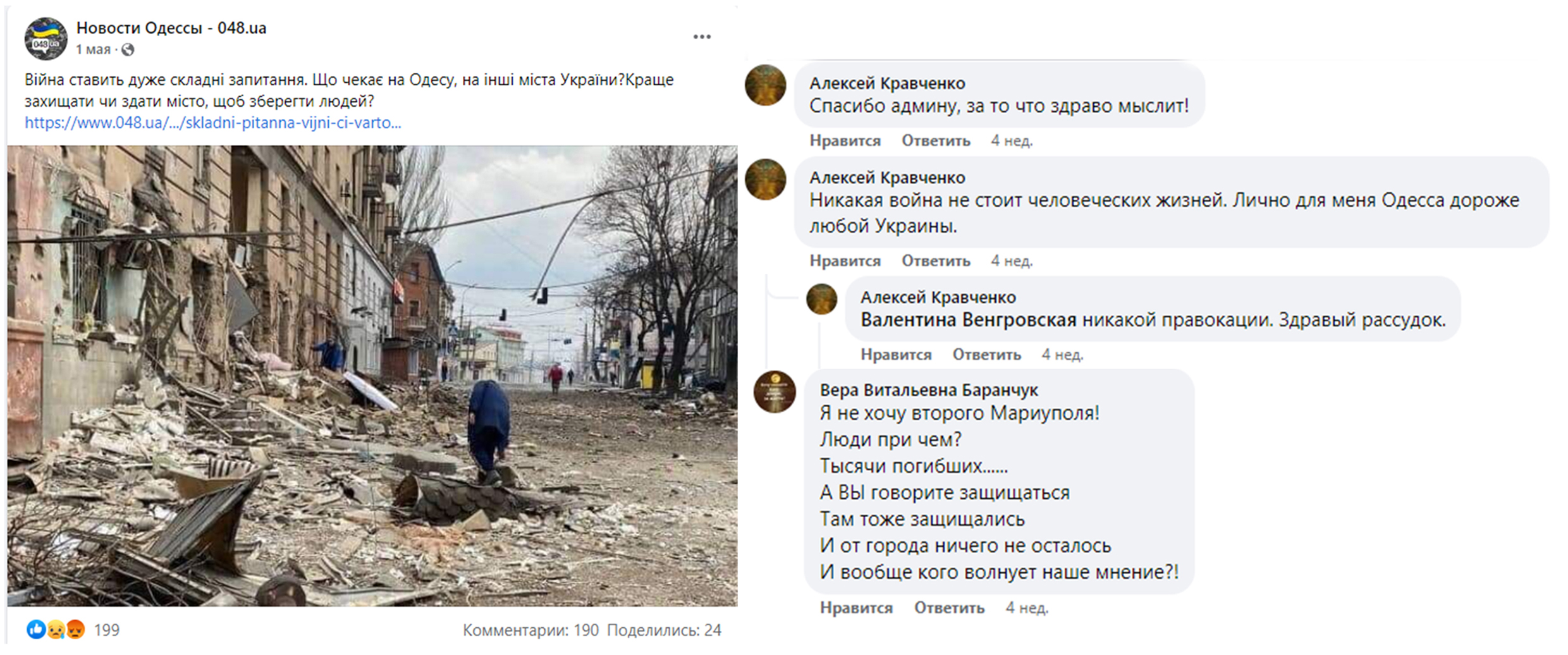 Одразу привертає до себе увагу публікація на фейсбук-сторінці «Новости Одессы – 048.ua», де ставиться питання, чи варто захищати Одесу від російських загарбників або буде краще «здати місто, щоб зберегти людей». Цей допис викликав бурхливу реакцію, як реальних користувачів, так і значну активність ботів. У коментарях, окрім обурення, також з’явилися дописи, в яких схвально сприймали перспективу віддати місто ворогу.