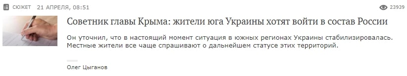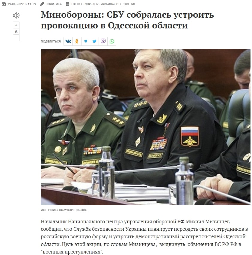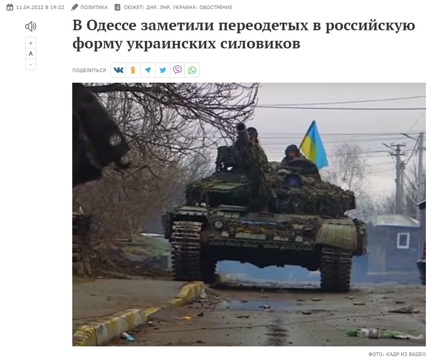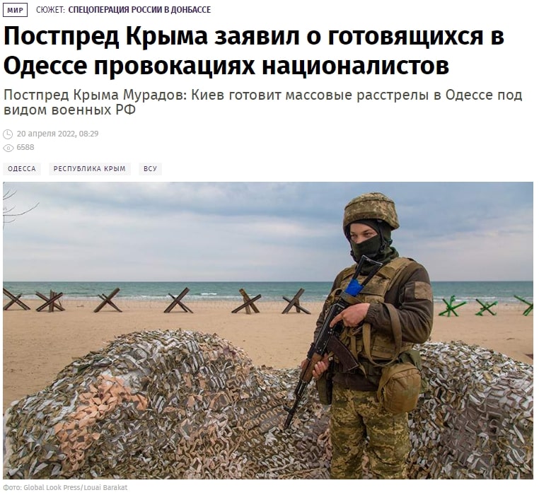 В той самий час, в якості превентивних заходів проти ймовірних звинувачень росії в чергових військових злочинах, публікувалися статті про українських націоналістів, які переодягалися в російську форму для вчинення провокацій. Зокрема, вказувалося, що на вулицях Одеси з’явилися перевдягненні українські військовослужбовці для «проведення чергової провокації з метою дискредитації російських збройних сил».