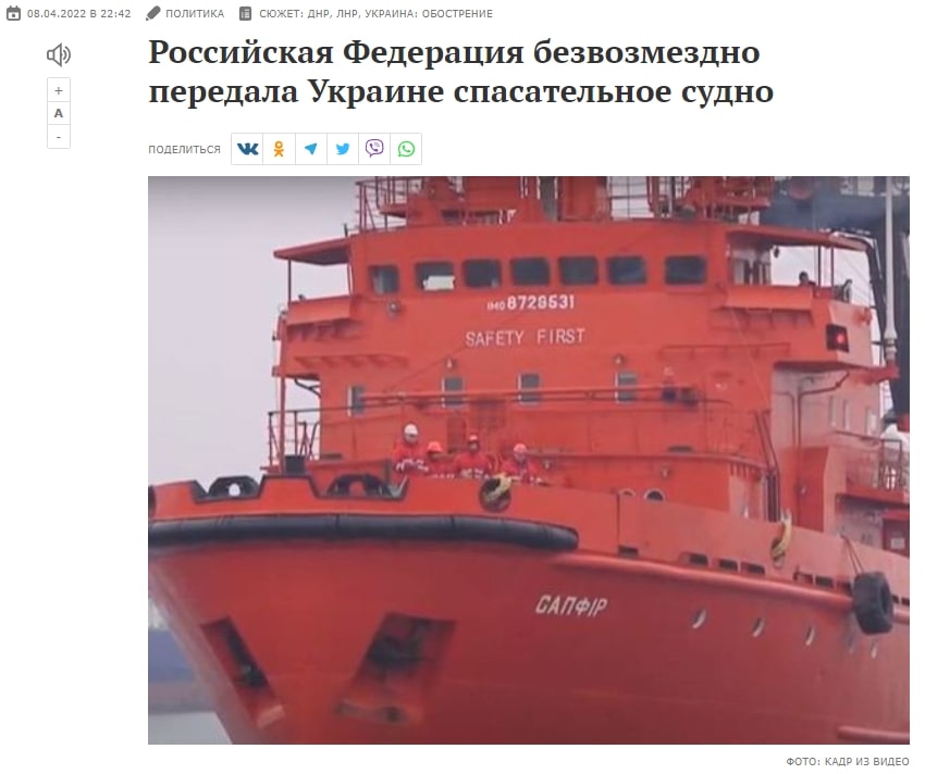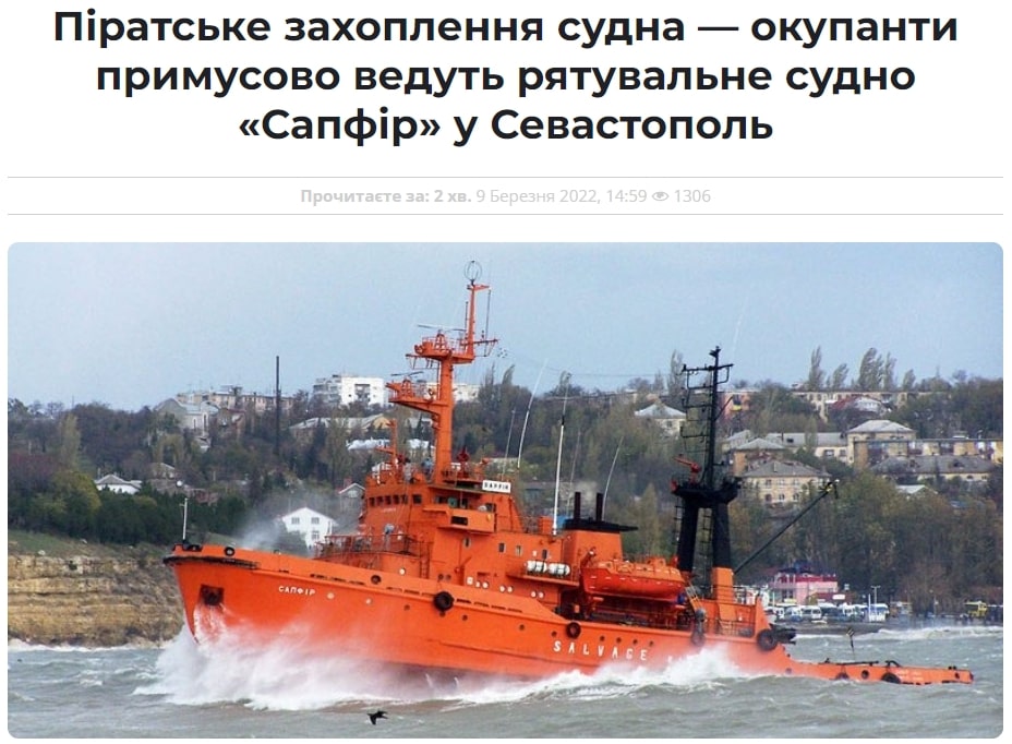 Не забула держава орків й похвалитися тим, що безоплатно передала Україні рятувальне судно. Адже росія за версією пропаганди «прагне забезпечити максимальну безпеку для цивільного судноплавства в Азовському, Чорному та Середземному морях», а Україна «намагається ухилитися від обговорення питання забезпечення безпеки іноземних суден, що знаходяться в портах Чорного та Азовського морів». Тому заради деблокади та убезпечення виходу іноземних суден із чорноморських портів росією була здійснена безкоштовна передача Україні рятувального судна «Сапфір». Однак в своїх публікаціях росіяни не вважали за потрібне вказати, що рятувальне судно «Сапфір» і так є українським, а також про те, що воно було піратським чином захоплене російськими окупантами 26 лютого 2022 року в районі острова Зміїний.