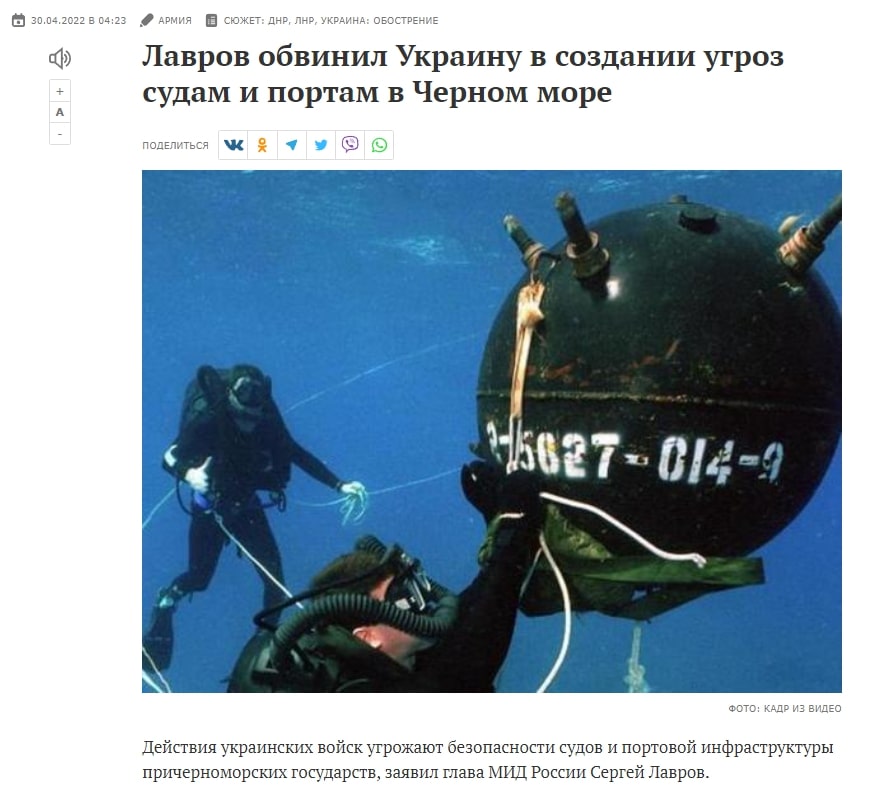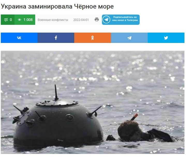 У спотвореній реальності пропагандистів збройні сили України «розкидали» вздовж чорноморського узбережжя старі міни, які відірвалися від якорів та попливли за течією, допливши до Криму, Туреччини, Болгарії тощо. І саме тому Чорне море є заблокованим для цивільного судноплавства.