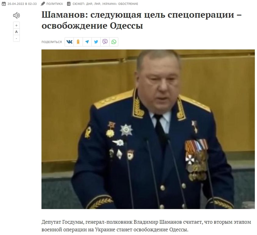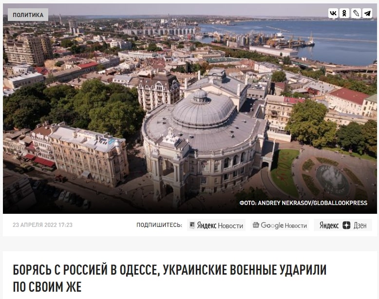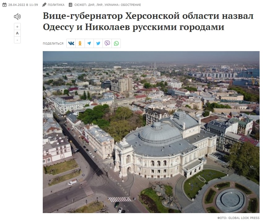 Паралельно наприкінці квітня 2022 року значно зросла кількість дописів на тему «Одесса – русский город». Вказані публікації супроводжувалися «глибокою стурбованістю» авторів, щодо того, які страшні загрози несе в собі знаходження території півдня України під контролем українських націоналістів. Вказувалося, що якщо залишити південні території на відкуп владі України, то населенню, яке там проживає, «загрожує катастрофа, репресії та ймовірне фізичне знищення багатьох тисяч людей». Ця думка неодноразово повторювалася в російських ЗМІ з неодмінним висновком, що в південні регіони мають бути «звільнені» та там мають бути проведені референдуми, оскільки громадяни, що там мешкають, «мають право на самовизначення».