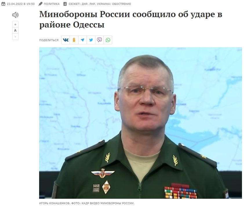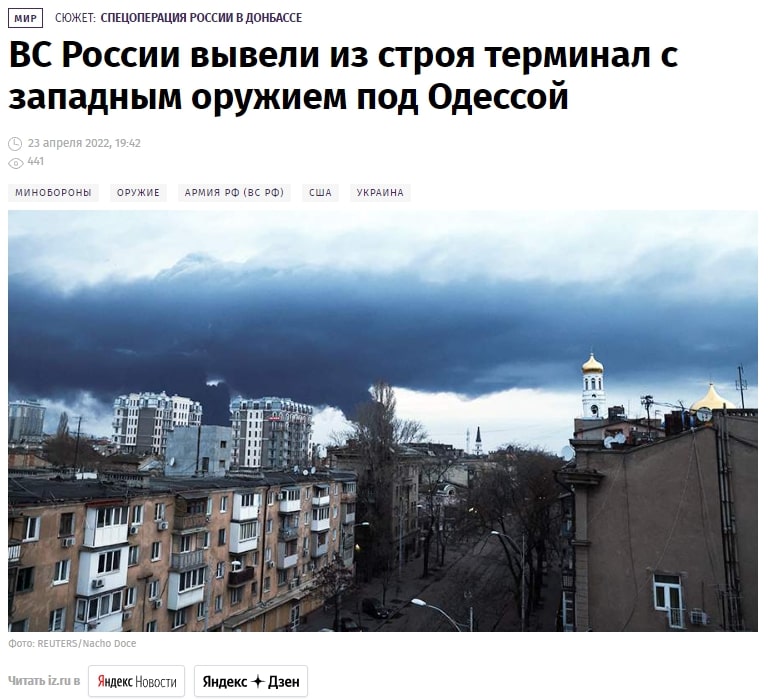 Офіційний представник міністерства оборони рф ігор конашенков в той самий день також повідомив про завдання росією «високоточного ракетного удару в районі Одеси» по військових об’єктах. Він повідомив, що в результаті було вражено логістичний термінал на військовому аеродромі, де зберігалася «велика партія іноземного озброєння, що надійшло від США і європейських країн» (жодного слова про житлові будинки, загибель мирного населення та всього того, що відбулося в цей день в Одесі насправді).