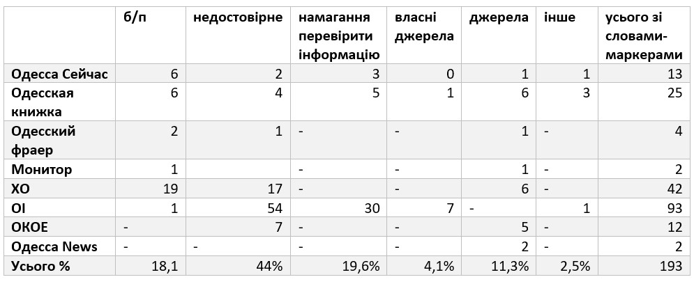 Лише 15,4% із них мали посилання хоча б на якісь джерела (офіційні чи власні). Решта містили ті або інші порушення із стандартом достовірності. 44% послуговувалися недостовірними джерелами (найбільше «Одесса Info» та «Х..вая Одесса»). 18,1% дописів були поширені взагалі без будь-якої вказівки на джерело і можуть вважатися чутками (найбільше – «Х..вая Одесса»). У 19,6% випадків видання намагалися перевірити інформацію, але також не ставили посилання на джерела (найбільше «Одесса Info»).