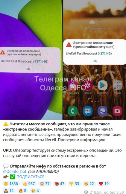 Однак ми зафіксували випадки, коли дописи, що містили слово-маркер «масово», були неманіпулятивними. Той самий канал «Одесса Infо», допис за 17 квітня. У тексті йшлося про те, що читачі «масово» отримали повідомлення на мобільний телефон від оператора. У дописі не обмежилися констатацією факту, але розібралися із тим, що сталося, перевірили інформацію. З’ясувалося, що це було тестування системи масового оповіщення.