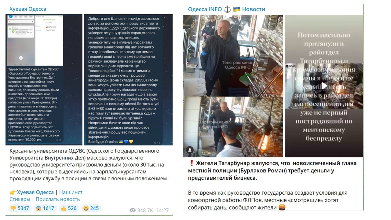 Так само 7 квітня телеграм-канал «Одесса Infо» опублікував пост про те, що жителі Татарбунар жаліються на голову місцевої поліції. Але у дописі розказано лише одну історію, хоча у ній зазначено «я уже не первый пострадавший по ментовскому беспределу».