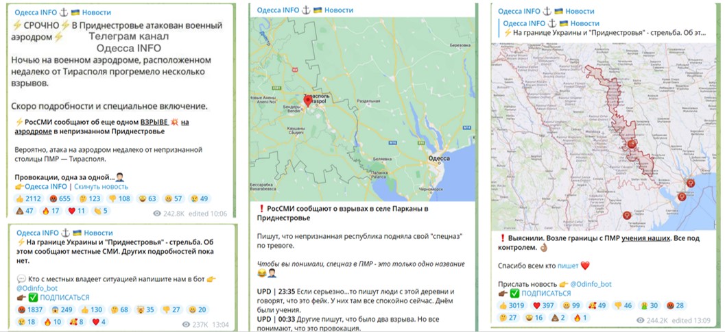 Щоправда, повідомлення «РосСМИ» на каналі із часом перевірили, як змогли. В одному випадку одні неназвані місцеві жителі написали, що у них «все спокійно», а інші – що були вибухи. Щодо «стрілянини» на кордоні теж інформацію із часом додали, і теж без конкретики: «Выяснили. Возле границы с ПМР учения наших. Все под контролем».