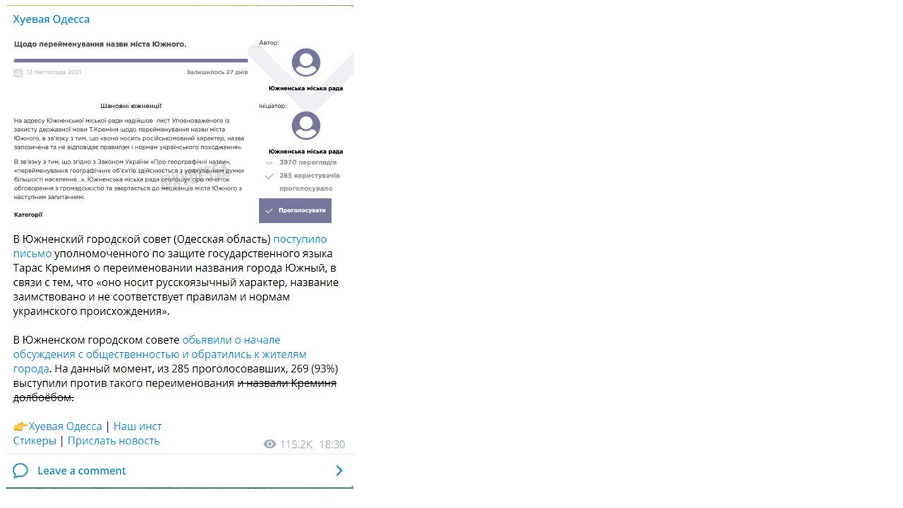 Найбільш дивним під час можливої ескалації конфлікту з РФ виглядає ось цей допис телеграм-каналу "Одесса Info". Із опитування Радіо Свобода, яке журналісти проводили у Харкові, вирізали та склеїли декілька реплік містянина Олексія, де він сказав, що "воювати ніхто не буде", "захищати нам нічого" і що росіяни "брати". Цікаво, що в опитуванні були й протилежні думки, які в пост чомусь не включили. Ще одне запитання: чому для одеського телеграм-каналу інформаційним приводом виступає заява про "братню" Росію пересічної людини із Харкова? Можливо, симпатія?.. Чи все ж щось інше?