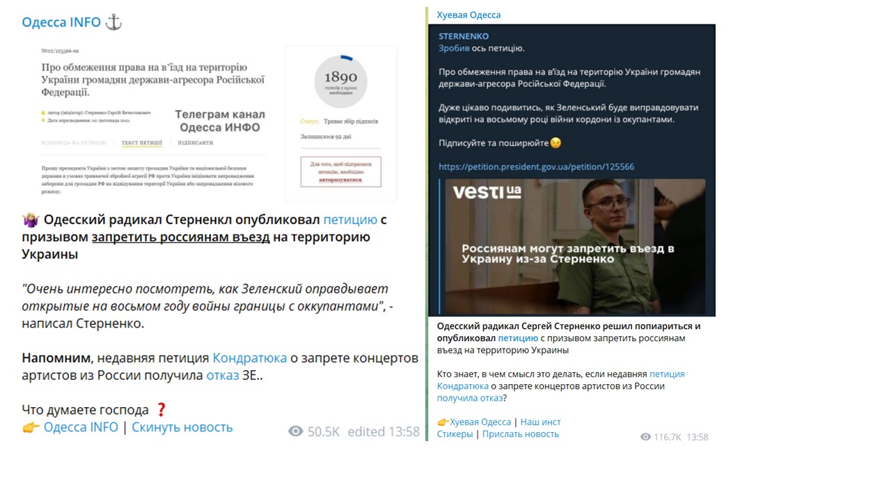 Схожий принцип використовується і щодо одеського активіста Сергія Стерненка. У дописах його ініціатива щодо заборони в’їзду для громадян РФ або ж щодо впровадження візового режиму називається "піаром", також ставиться запитання "в чому смисл це робити". "Одесса Info" додає відповідне "емоджі".
