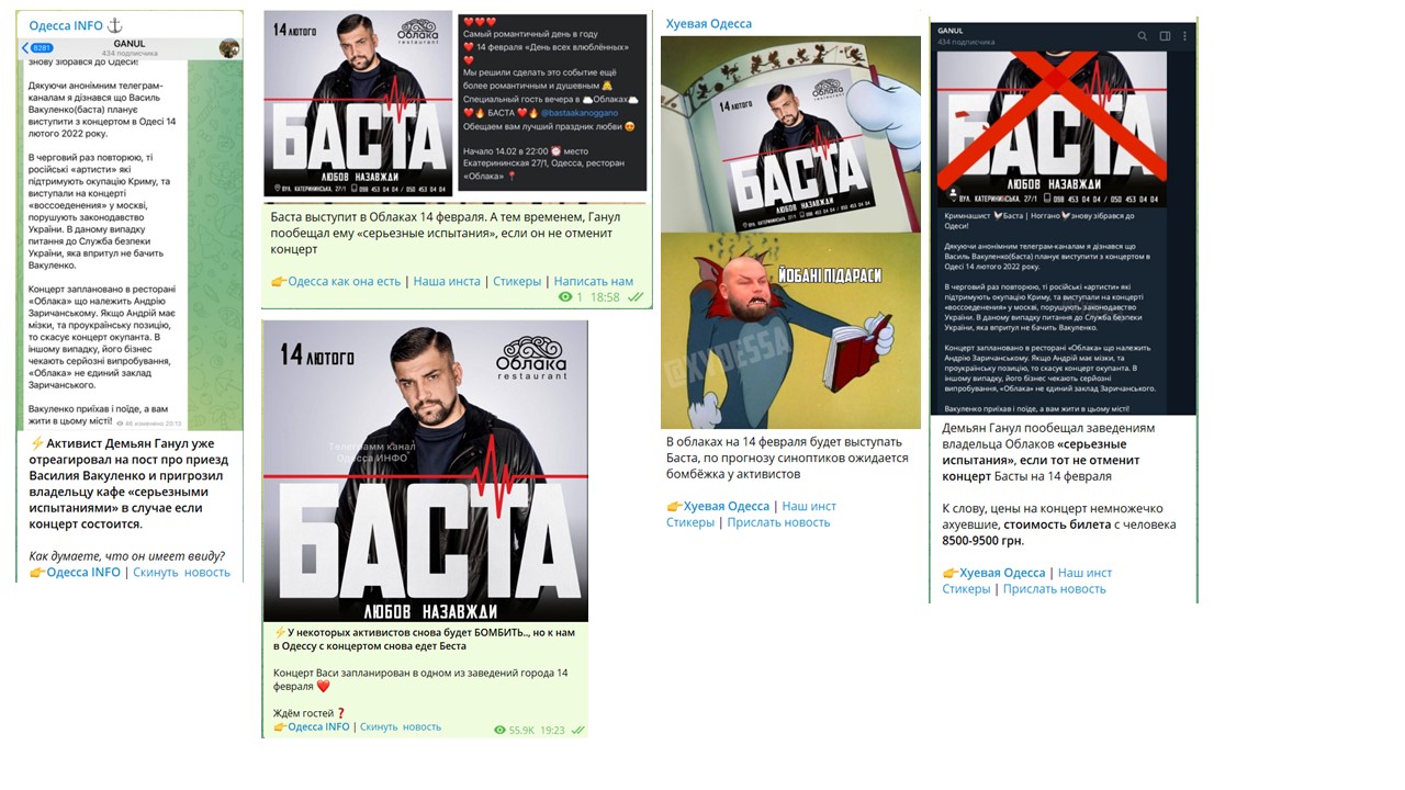 Важливо також додати і про те, як телеграм-канали висвітлюють новини щодо деяких громадян РФ, що підтримали російську агресію проти України. Показовим тут є випадок із запланованим в Одесі на 14 лютого концертом російського репера Басти, який виступав в анексованому РФ Криму. Так, медіа подають цю ситуацію нібито як самотній протест одеського активіста Дем’яна Ганула. І майже не згадують, в чому ж насправді проблема виступу російського музиканта.