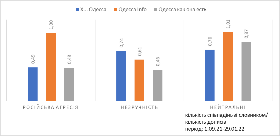 Так, ми побачили, що найбільше фрейм "російська агресія" представлений у телеграм-каналі "Одесса Info", що означає, що більшість дописів містить згадку про це (так, найбільше зустрічалися слова "військовий", "НАТО", "вторгнення", "загроза"). Натомість два інших канали писали про агресію удвічі рідше. Натомість "Х..вая Одеса" в лідерах за фреймом "незручність". Тобто найбільше у дописах з вибірки містилося згадок про дискомфорт, який виникає через "українізацію" (найчастіше згадувалися слова "заборона", "штраф", "скандал"). У цього ж каналу було найменше нейтральних згадок.