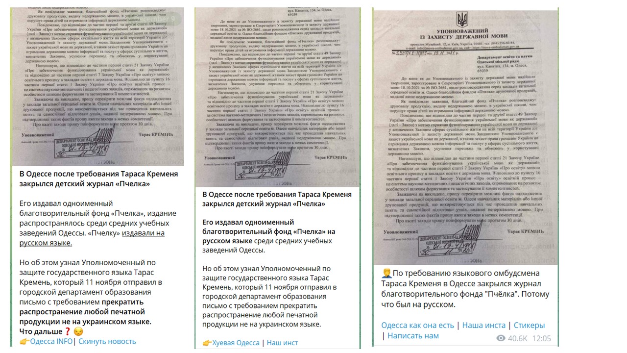 Ще один спосіб "похайпувати" на темі мови для одеських телеграм-каналів – це висвітлення діяльності "мовного" омбудсмена Тараса Кременя. Так, усі три медіа поширили інформацію про те, що після вимоги омбудсмена в Одесі закрився дитячий журнал "Пчелка". "Х..вая Одесса" та "Одесса Info" надрукували про це майже ідентичні дописи. Ця ситуація – просто ідеальний спосіб поширити той же наратив про утиски: тут фігурують діти (утискають навіть їх!), видає журнал благодійний фонд (і це не виявилося перешкодою!). Також два телеграм-канали роблять цікавий підсумок про те, що Кремінь нібито вимагає "прекратить распространение любой печатной продукции не на украинском языке". Хоча якщо уважно почитати сам лист, то там немає нічого саме про цю вимогу.