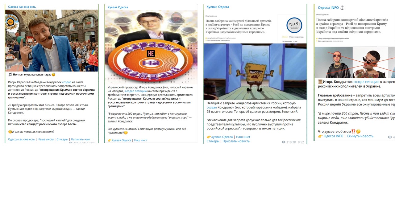 Із здивуванням одеські телеграм-канали зустріли й петицію Ігоря Кондратюка щодо заборони концертної діяльності артистів РФ, які підтримали російську агресію. От тільки в дописах популярних одеських телеграм каналів про це уточнення (що петиція стосується не всіх) згадують не завжди. Деякі дописи супроводжуються мемами, а також запитанням "свистанула фляга у мужика или все правильно?"