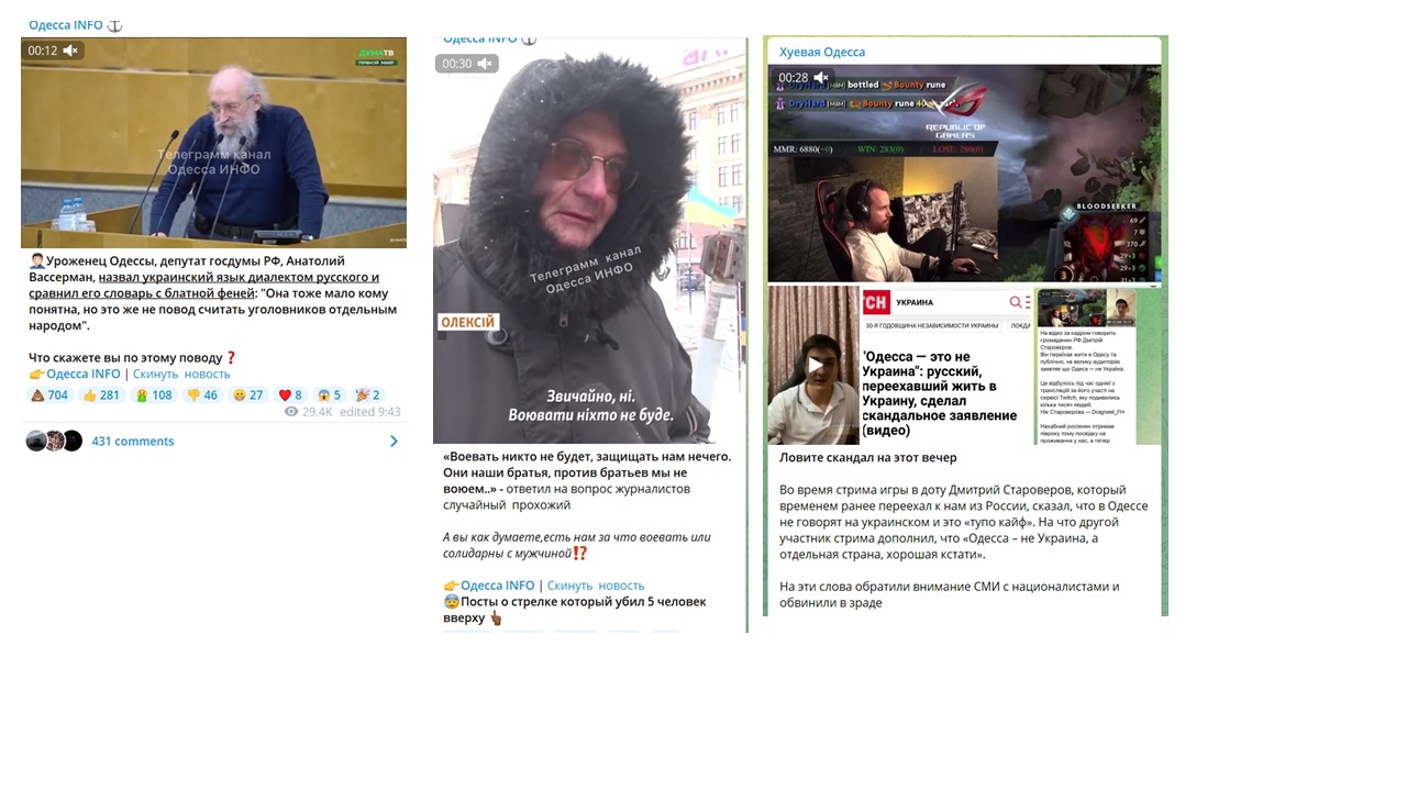 Огляд контенту найпопулярніших одеських телеграм-каналів показує, що повідомлення із ознаками проросійської пропаганди поширюються тут за давно відомим принципом "нагромадження карт". Під певну картинку (наприклад, переслідування російськомовних) добираємо відповідний контент. Іншу сторону намагаємося не показувати.