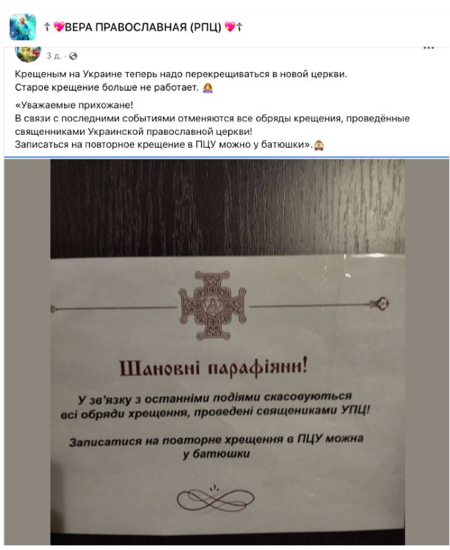 Для педалювання теми ставлення до релігії в Україні пропагандисти іноді вдаються до брехні на рівні фантастики. Так у мережі фейсбук розповсюджують "оголошення", яке нібито належить Православній церкві України, в якому йдеться про те, що парафіяни, охрещені священником УПЦ, повинні "повторно пройти хрещення у священника ПЦУ".