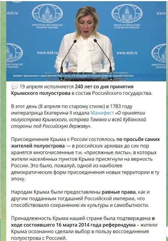 Речниця міністерства закордонних справ росії Марія Захарова заявила, що 19 квітня виповнюється 240 років з дня "прийняття" Кримського півострова до складу росії. За її словами, сталося це у 1783 році, коли Катерина II підписала "Маніфест про прийняття Кримського півострова, острова Тамань і всієї Кубанської сторони під державу Російську".