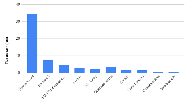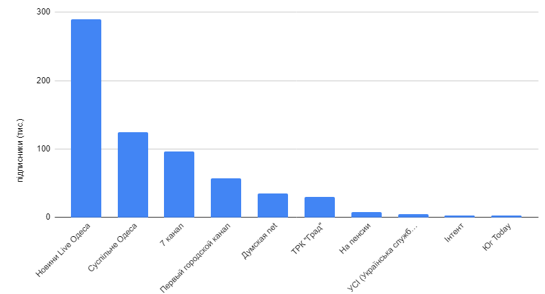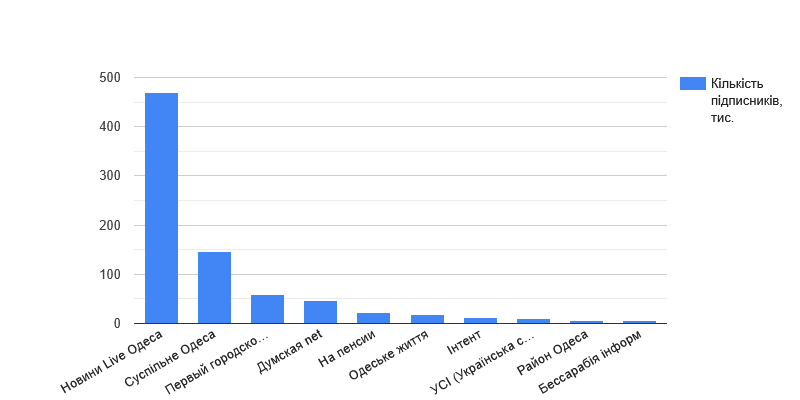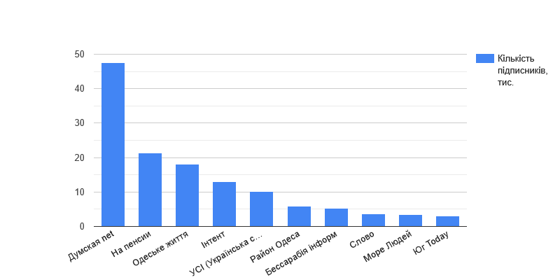 Як видно з таблиці, лідери присутності в YouTube — "Новини Live Одеса" та "Суспільне" — суттєво наростили кількість підписників. Але найстрімкіше зростання продемонстрували "На пенсії" (майже втричі), youtube Інтент (більш ніж у 4 з половиною рази) та "Одеське життя" (приблизно вп’ятеро).