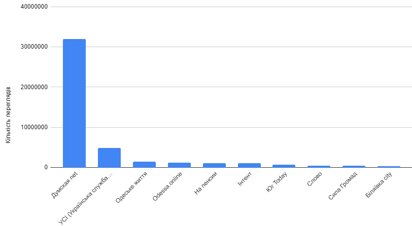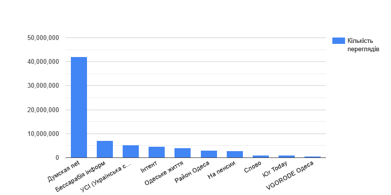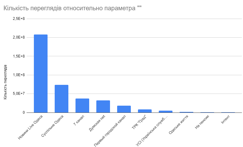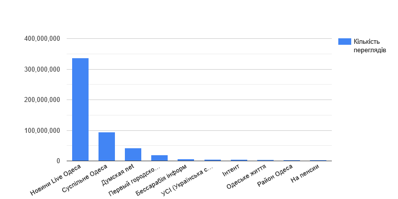 За цим показником десять найкращих залишили 7 канал та ТРК "Град", які не оновлюються. Місце "Граду" на шостій позиції зайняла Українська служба інформації, яка рік тому була сьомою. Тепер на сьому сходинку став "Інтент", який торік за кількістю переглядів був останнім у топ-десятці, але з того часу встиг набрати понад 4 з половиною мільйони переглядів. Також зазначимо, що за показником "кількість переглядів" розрив між першою та десятою сходинкою збільшився, якщо порівняти з минулим дослідженням: понад 336 з половиною мільйонів переглядів у "Новини Live Одеса" і трохи менше трьох мільйонів у "На пенсії".