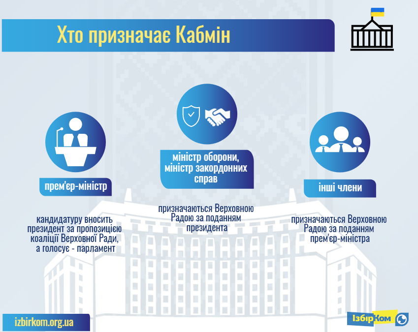 Після того як прем'єр-міністра обрано, він подає до парламенту кандидатури членів Кабінету Міністрів, крім тих, яких подає президент, а це міністр оборони і міністр закордонних справ. При цьому Рада може як проголосувати за весь склад Кабміну одним списком, так і за окремі кандидатури.