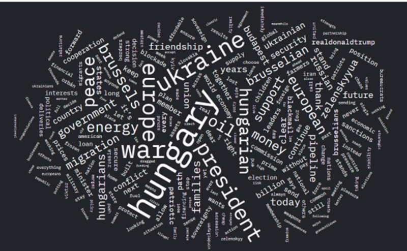 Подивимося тепер на хмару слів, згенеровану на основі твітів Віктора Орбана за останні п’ять місяців (усього 349 дописів). Топ-три слова: Угорщина, війна та Україна. У двадцятку входить ще пара ворогів Орбана: Брюссель та міграція. Велика увага приділяється темам енергетики та нафти, адже саме Брюссель та Україна "не дають" угорцям скористатися дешевими російськими ресурсами.