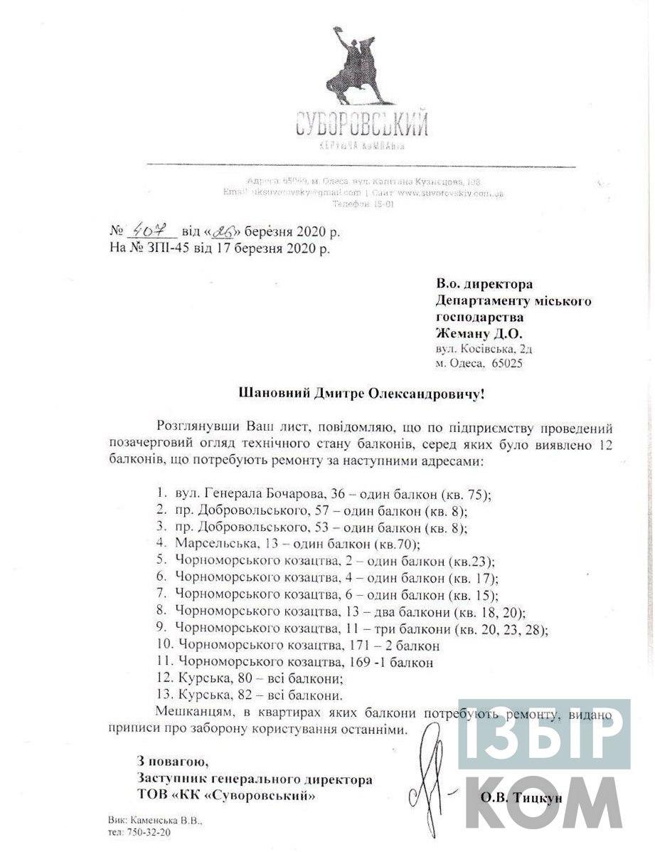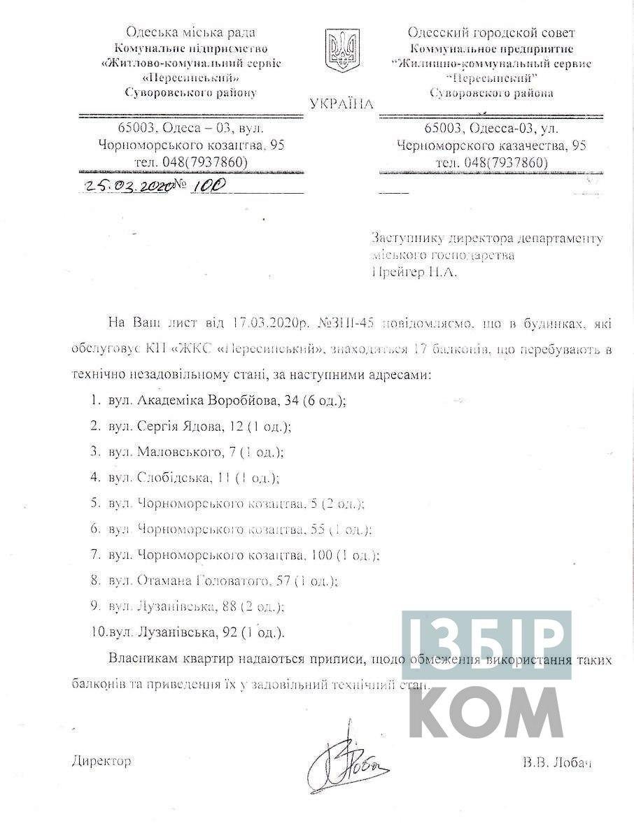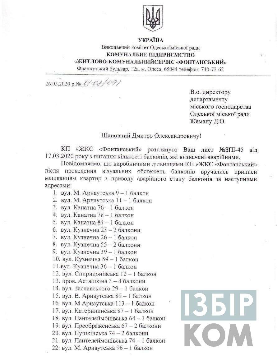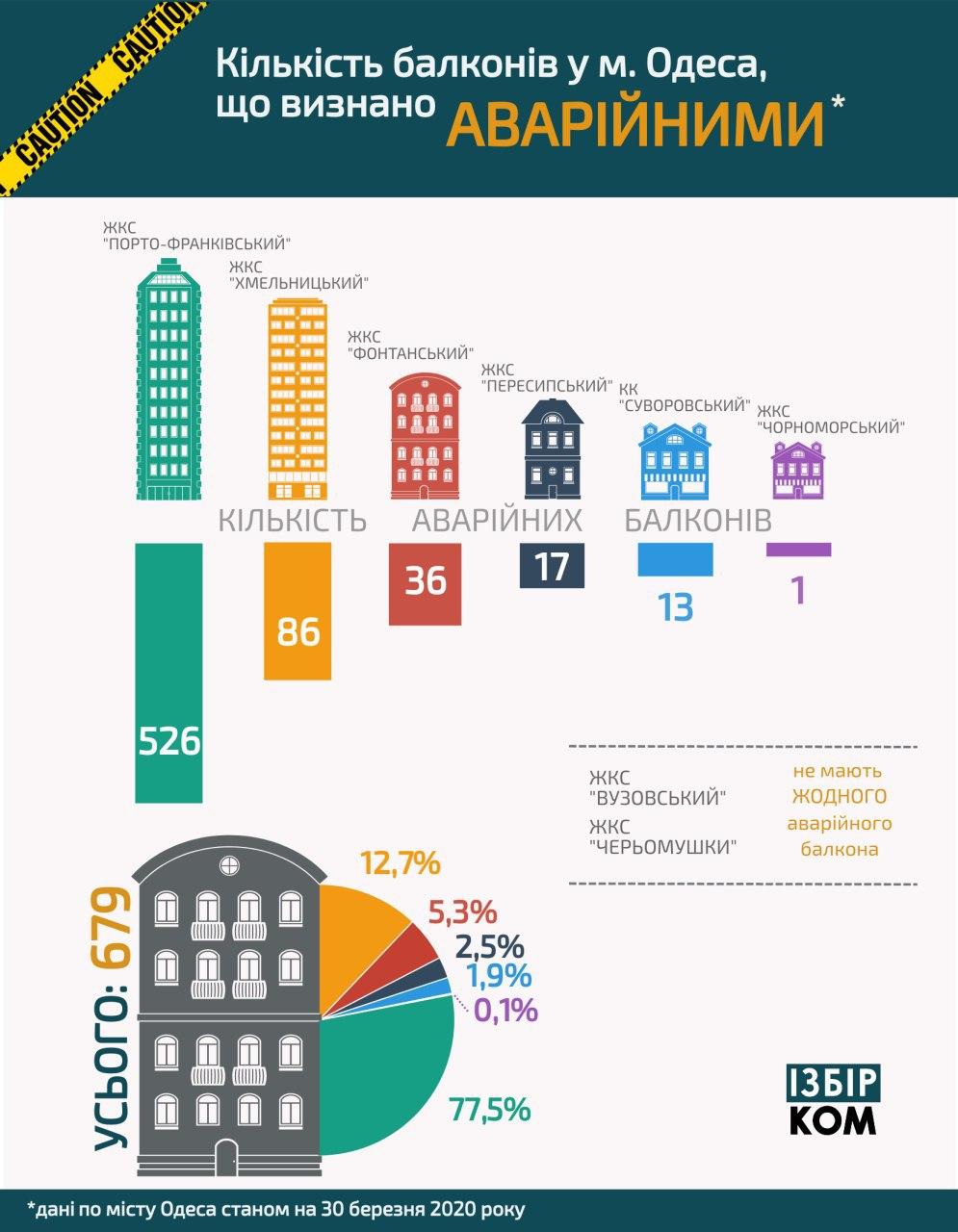 Загалом у місті нараховується 678 балконів, непридатних для подальшої експлуатації. Найбільша частина з них виявлена на території, яку обслуговує ЖКС «Порто-Франківський» - 526. На території обслуговування ЖКС «Хмельницький» - 86 таких балконів, ЖКС «Фонтанський» - 36, ЖКС «Пересипський» - 17, КК «Суворовський» - 13. Лише один аварійний балкон є на території, яку обслуговує ЖКС «Чорноморський», і жодного - на територіях ЖКСів «Вузовський» та «Черьомушки».