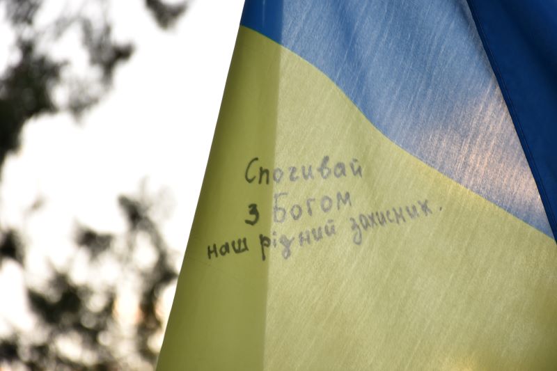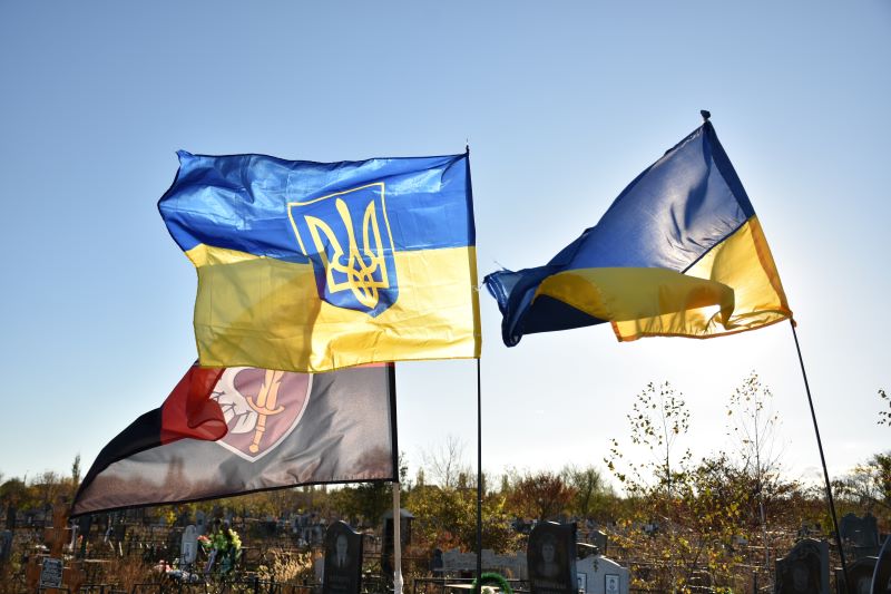 Могила десантника Дмитра Щербініна – у центрі. Сонце підсвічує великий синьо-жовтий прапор.