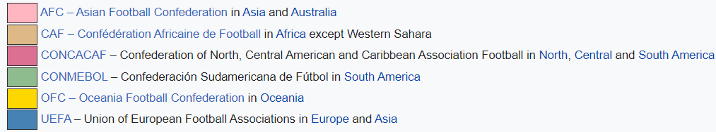 До складу ФІФА входить 211 членів. Членами організації є країни та території, які не мають статусу самостійної держави. Так, окремими членами ФІФА є чотири складові Великобританії (Англія, Шотландія, Уельс, Північна Ірландія) та два особливі адміністративні райони Китаю (Гонконг та Макао). Усі члени ФІФА поділяються на шість футбольних конфедерацій: Азійська футбольна конфедерація (АФК), Конфедерація африканського футболу (КАФ), Конфедерація футбольних асоціацій Північної, Центральної Америки і Карибського регіону (КОНКАКАФ), Південноамериканська футбольна конфедерація (КОНМЕБОЛ), Конфедерація футболу Океанії (ОФК) та Союз європейських футбольних асоціацій (УЄФА).