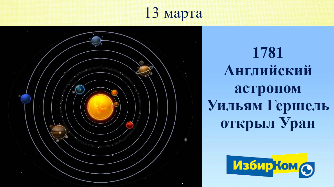 13 марта 1781 года английский астроном Уильям Гершель вел очередное наблюдение за звездами созвездия Близнецов. Поздно вечером он заметил, что одна из них явно крупнее соседних. Сначала Гершель принял открытое небесное тело за комету, а отсутствие хвоста этой кометы он объяснил ее движением к Земле. Однако несколькими месяцами позже выяснилось, что это не комета, а ранее неизвестная планета Солнечной системы, расположенная от Солнца седьмой по счету. По размерам новая планета являлась третьей после Юпитера и Сатурна. Вновь открытое небесное тело Гершель назвал планетой Георга в честь правившего в то время в Англии короля Георга III. Однако это имя не прижилось, а общепринятым стало более подходящее название – Уран.