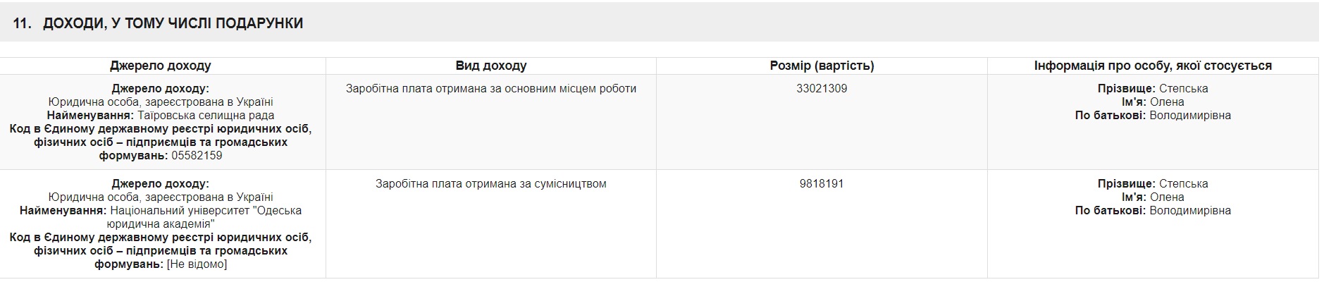 Кроме того, в электронной декларации чиновницы указана зарплата по совместительству в Национальном университете «Одесская юридическая академия», где она занимает пост доцента кафедры аграрного, земельного и экологического права на сумму 9 миллионов 818,1 тысяч гривень.