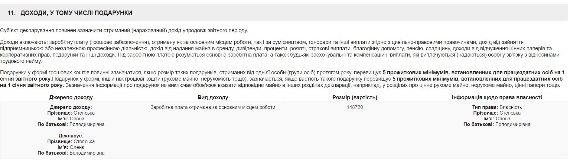 Примечательно, что в декларации за 2018 год Елена Степская задекларировала зарплату в ЦПАУ на сумму 148 тысяч 720 гривень. Возможно, при подаче декларации она неверно указала размер заработной платы за 2019 год, например, перепутав запятую и точку, что имеет значение для обработки данных при их загрузке на сайт НАПК.