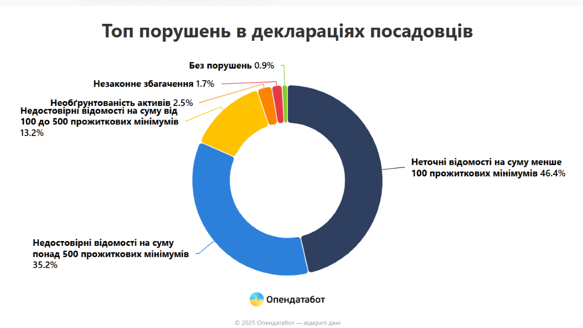 Признаки заведомо ложных данных содержали 423 декларации (35%) - это нарушение статьи 366-2 Уголовного кодекса. Общая сумма "ошибок" - более 5,8 миллиарда гривен (в среднем - 13,6 млн грн на декларацию).