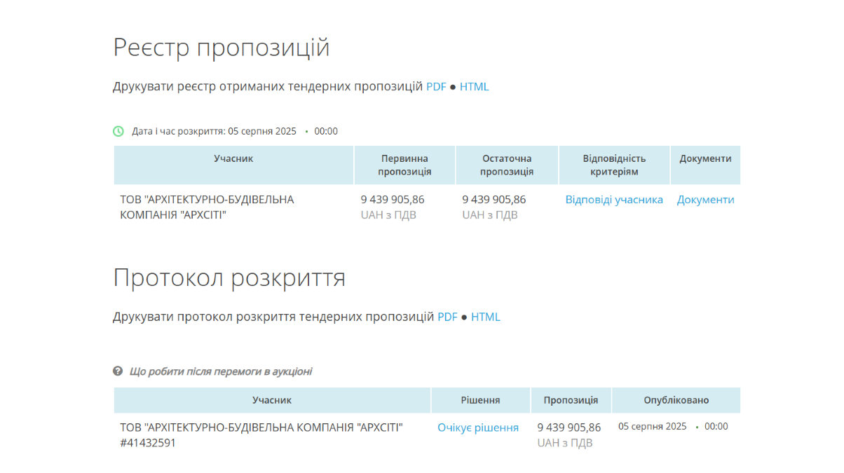 Единственным участником торгов стало ООО "Архитектурно-строительная компания "АрхСити", которая уменьшила цену всего на 192 тысячи гривен.