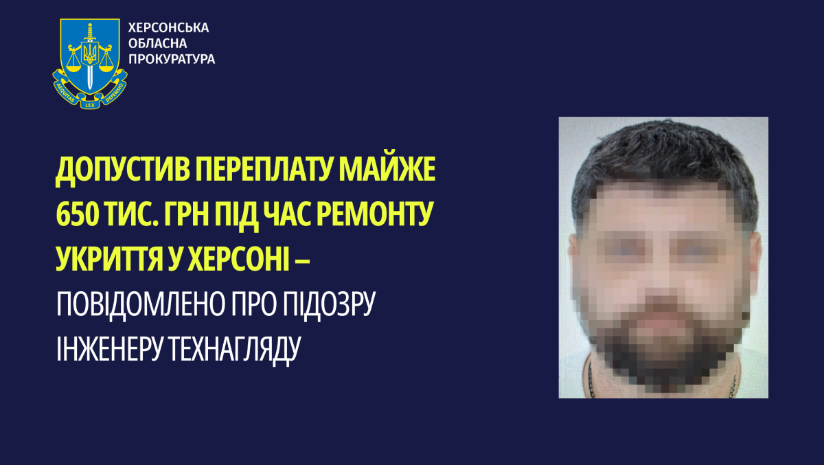 На Херсонщине инженера технадзора подозревают в служебной халатности во время ремонта укрытия. Мужчина формально проверял работы и подписал акт, не соответствующий фактическим объемам и расходам материалов.